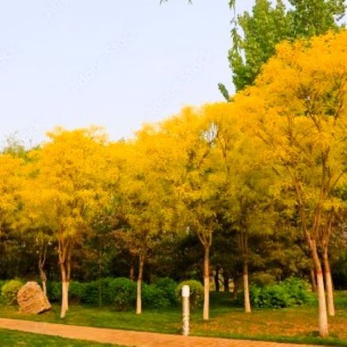 황금회화나무는 기존의 회화나무와는 다르게 목대와 잎에 페인트를 칠한 것 처럼